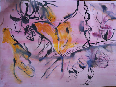 I like the way in which Julio Rondo has layed different materials to create these large art works. Its interesting that from a distance your eye focus' on the line, taking a closer look reveays layers of fine texture. Line is something I've come back to often in my work, it reminds me of a seris of paintings I made last year. Loosely applied ink or paint over wet paper allows the line to bleed and spread and merge into other colours.